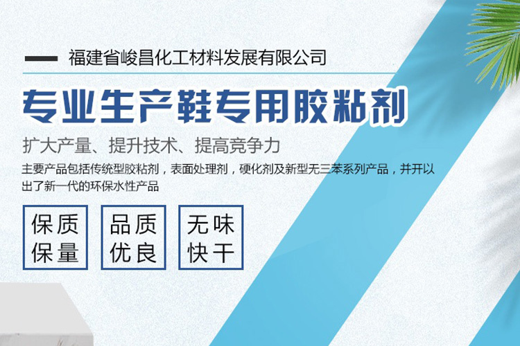 福建省峻昌化工材料發(fā)展有限公司總部設(shè)在中國鞋鄉(xiāng)——晉江。為更好、更方便服務(wù)廣大客戶,我司在廣東江門及福建均設(shè)有先進(jìn)的PU膠生產(chǎn)基地,歡迎廣大同行前來我司灌裝或批發(fā)銷售。公司是一家中外合資,面向亞太地區(qū)從事研究,生產(chǎn)銷售鞋用粘膠10多年的專業(yè)公司。從國外引進(jìn)生產(chǎn)能力為數(shù)萬噸的全套先進(jìn)生產(chǎn),檢驗(yàn)設(shè)備,與德國Bayer,日本DENKA及美國,西班牙等其它海外公司有著密切的原材料及技術(shù)合作。公司主要產(chǎn)品包括傳統(tǒng)型膠粘劑,表面處理劑,硬化劑及新型無三苯系列產(chǎn)品,并開以出了新一代的環(huán)保水性產(chǎn)品。供應(yīng)國內(nèi)外鞋業(yè),手提箱包及建筑工程單位使用。公司始終保持產(chǎn)品的良好品質(zhì)及專業(yè)特性,并倍受廣大客戶好評(píng)。
